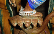 Lord Sri Krishna continues to bless His devotees in that same dancing posture of Kalinga Narthana Perumal at Oothukkadu. There are several factors that throw light upon the fact that the Panchloha idol of Sri Kalinga Narthana Perumal is not made by a sculptor. In the dancing posture of Sri Kalinga Narthana Perumal idol, the feet of the Lord do not touch the head of the serpent. There is a small gap between the sepent’s head and the left foot of the idol. The right leg of the idol is in mid air. The left hand of the idol does not fully hold the serpent’s tail for support. The entire weight of the idol is supported upon a slight contact between the left thumb of Sri Kalinga Narthana Perumal idol and the serpent’s tail. The remaining four fingers are not touching the serpent’s tail. On a closer look, one can also find scars on the right leg of Lord Krishna, below the knee, formed due to the voilent beating of the Kaliya, the serpent with its tail. This is an extraordinary form of sculpture that is not possible with the skill of any sculptor.