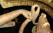 Lord Sri Krishna continues to bless His devotees in that same dancing posture of Kalinga Narthana Perumal at Oothukkadu. There are several factors that throw light upon the fact that the Panchloha idol of Sri Kalinga Narthana Perumal is not made by a sculptor. In the dancing posture of Sri Kalinga Narthana Perumal idol, the feet of the Lord do not touch the head of the serpent. There is a small gap between the sepent’s head and the left foot of the idol. The right leg of the idol is in mid air. The left hand of the idol does not fully hold the serpent’s tail for support. The entire weight of the idol is supported upon a slight contact between the left thumb of Sri Kalinga Narthana Perumal idol and the serpent’s tail. The remaining four fingers are not touching the serpent’s tail. On a closer look, one can also find scars on the right leg of Lord Krishna, below the knee, formed due to the voilent beating of the Kaliya, the serpent with its tail. This is an extraordinary form of sculpture that is not possible with the skill of any sculptor.